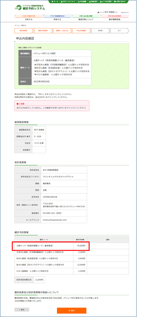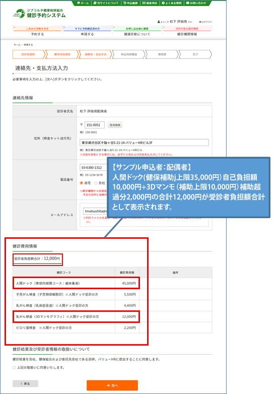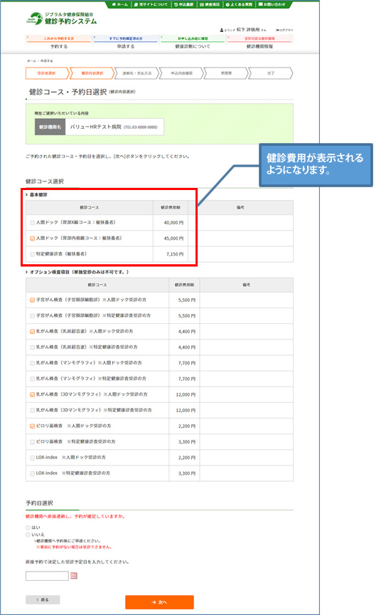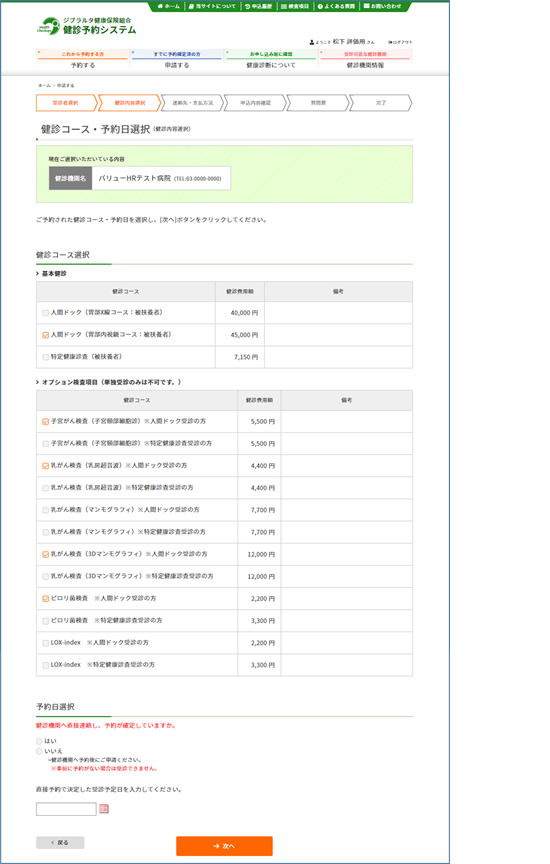 電話で予約した健診コース・予約日を選択し、〔次へ〕ボタンをクリックしてください。