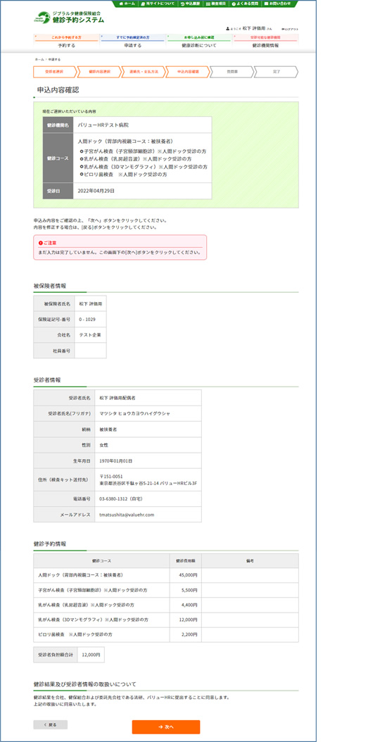 申込内容確認をして[次へ] をクリックしてください。
